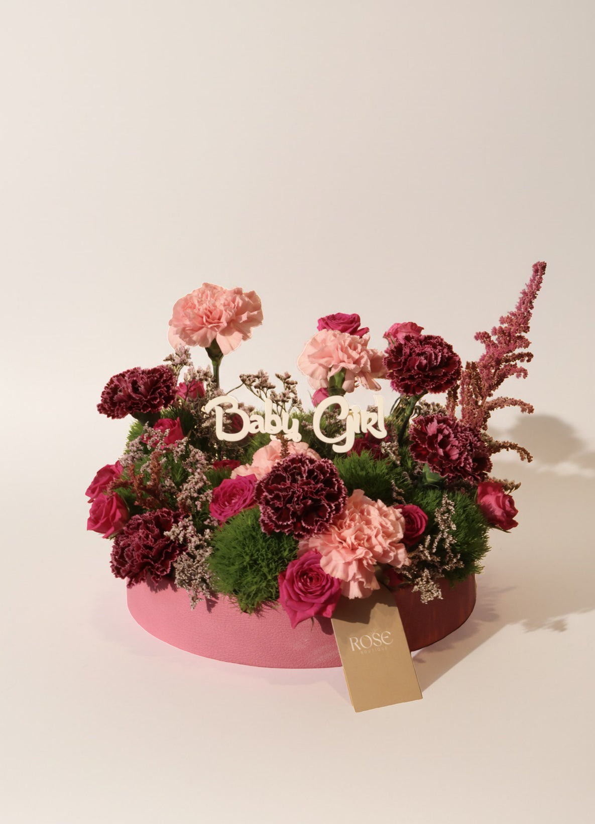 A delicate and feminine baby welcome arrangement featuring soft pink florals, gentle greens, and layered textures in a round floral box. Finished with a “Baby Girl” topper for a warm and heartfelt touch.