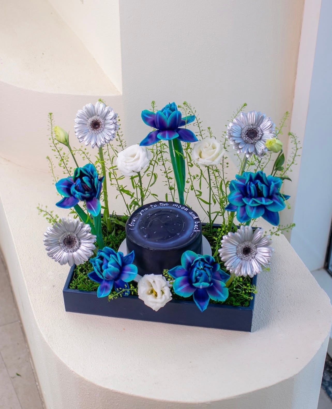 A stunning cake presented in a sleek leather tray, designed with a galaxy-inspired theme in rich blues and purples. Its complemented by fresh double blue tulips, white eustoma, delicate lipidium, and silver-sprayed gerbera, creating a beautiful and elegant arrangement for any special occasion.