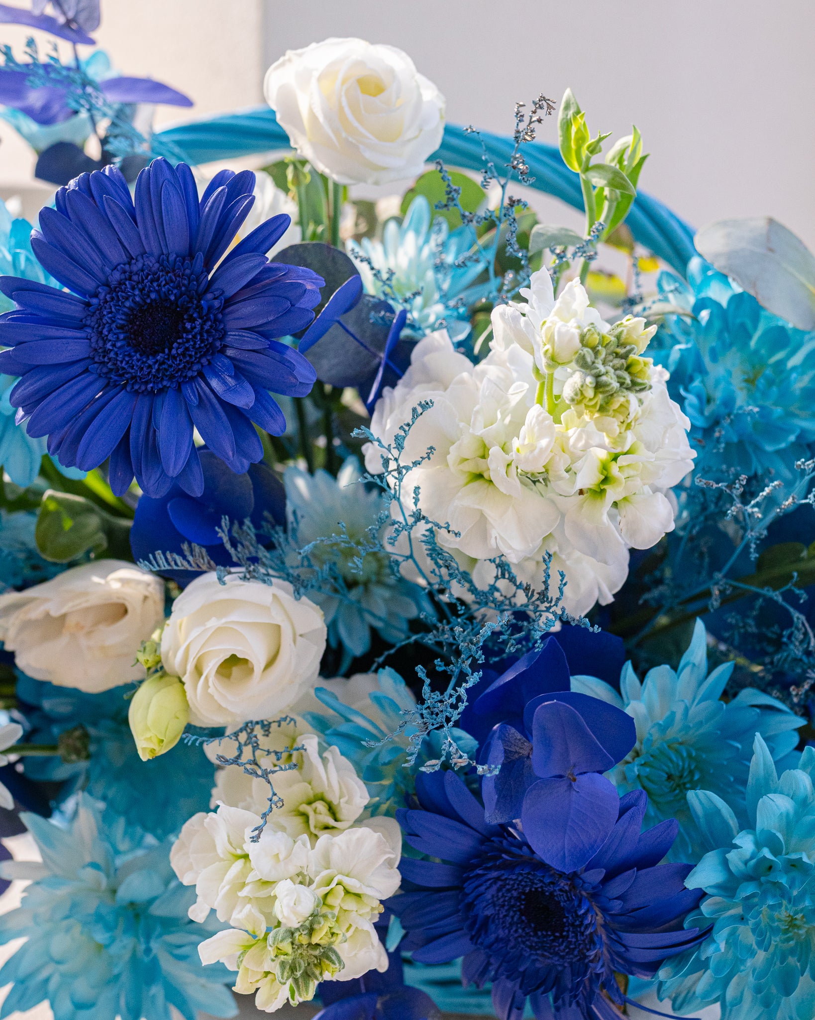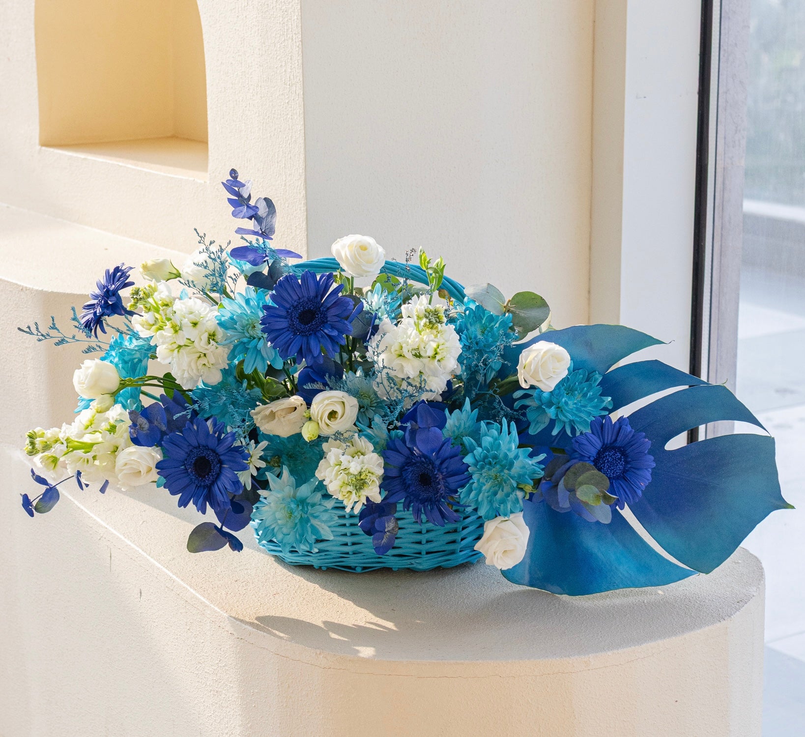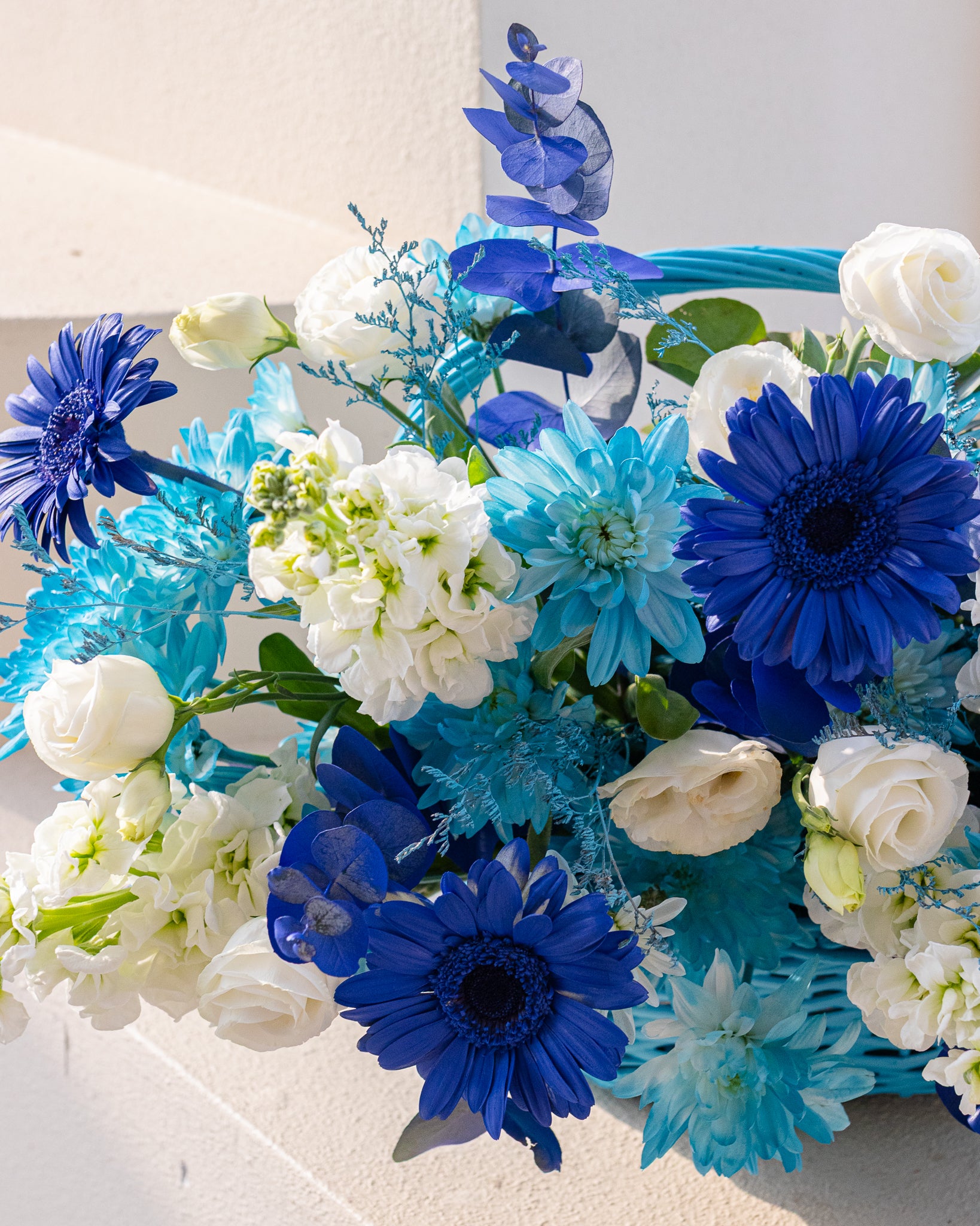 A serene blend of cobalt and ivory blooms that mirror the calm of ocean skies. Coastal Calm is elegance in motion, a basket of tranquility and timeless beauty.