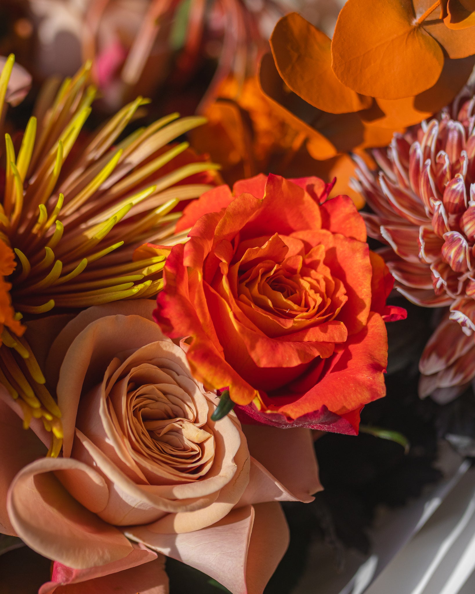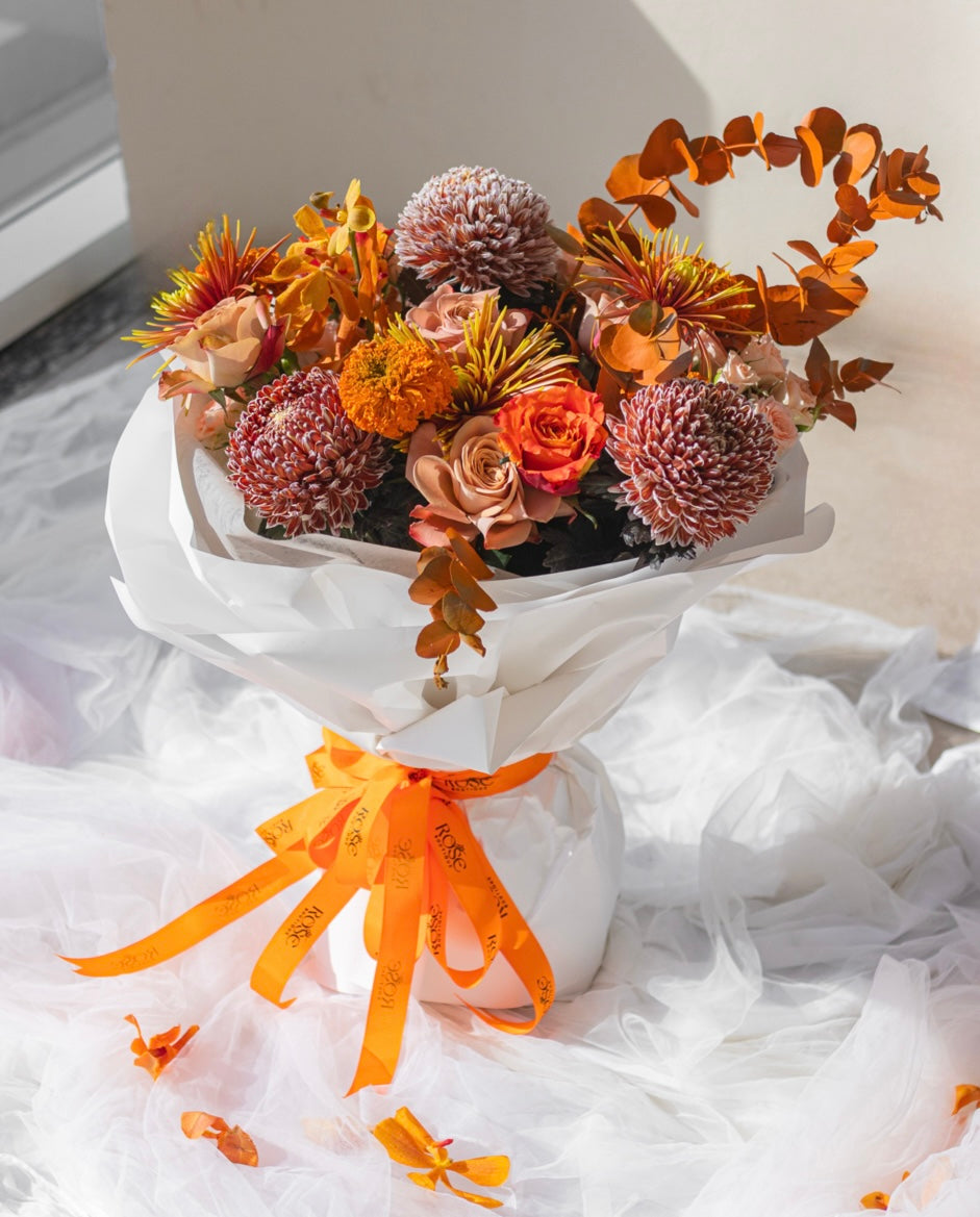 A dance of warmth and elegance — where amber tones meet soft peach and marigold hues. The Ember Bloom bouquet captures the cozy firelight of autumn days, wrapped in radiant charm and timeless grace.