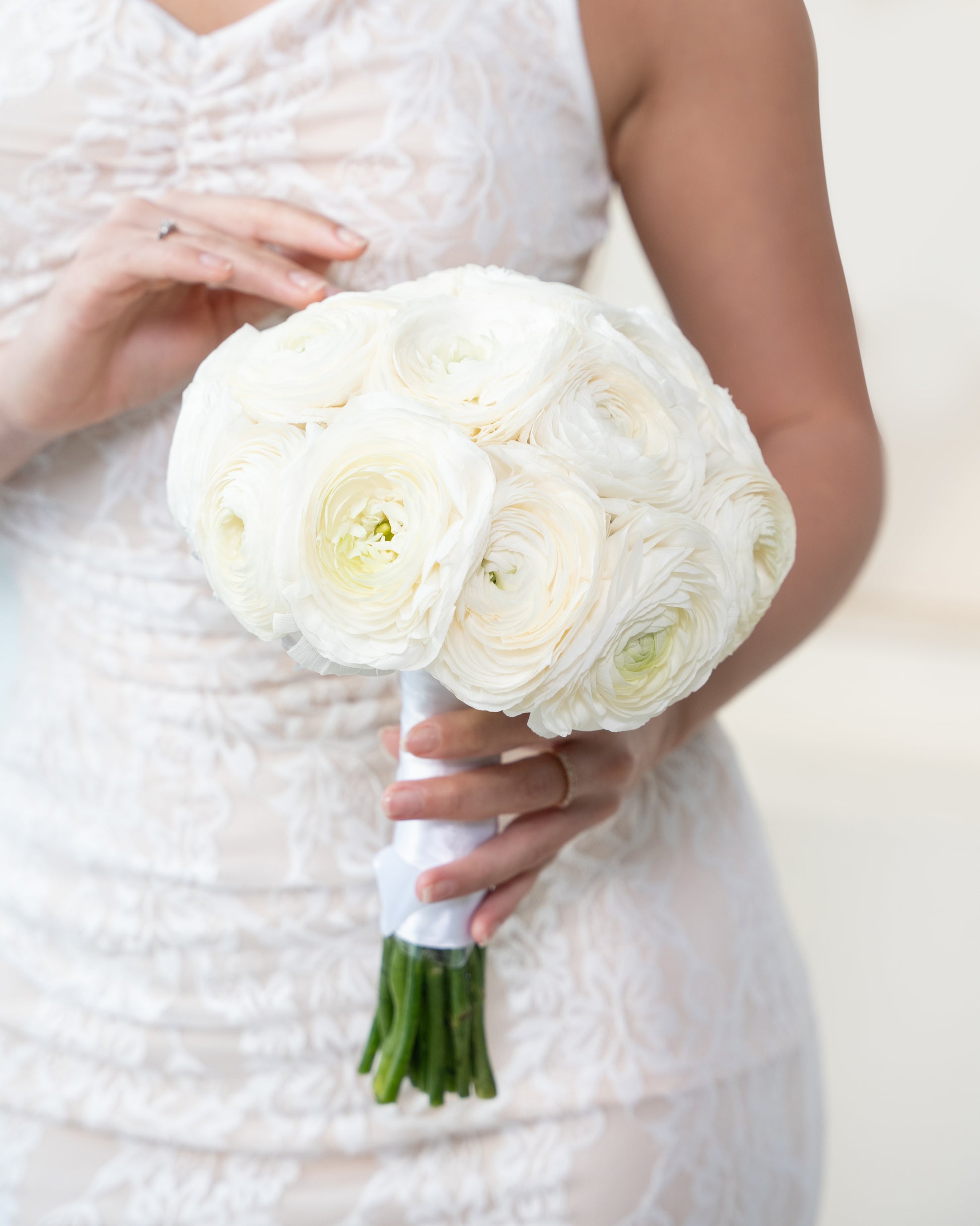 Timeless and beautifully refined, Ivory Aura is composed of lush white ranunculus blooms, gathered into a full, rounded bouquet that feels soft, romantic, and effortlessly elegant. Finished with a clean satin wrap and subtle crystal accents, this design highlights the natural beauty and delicate texture of each bloom.