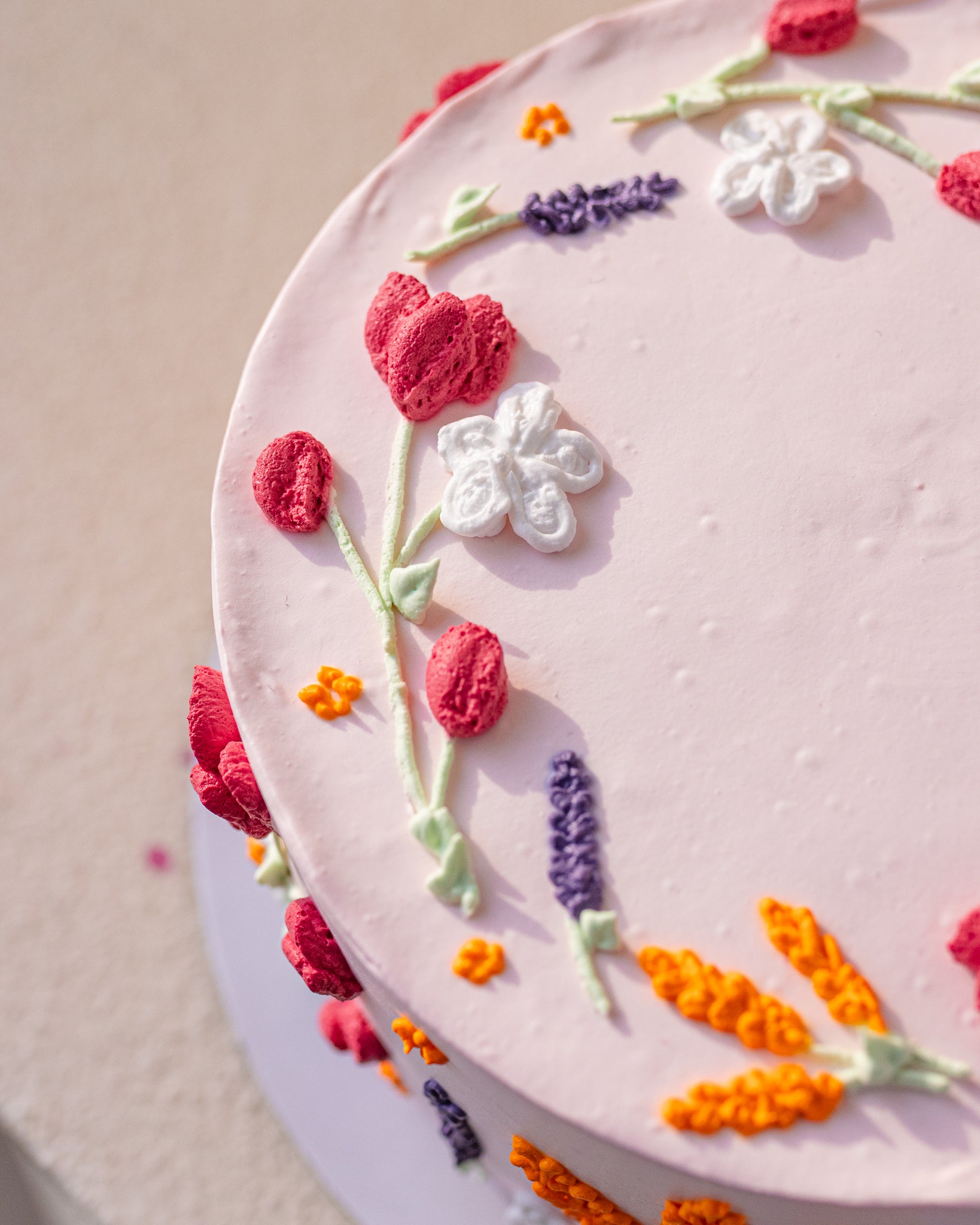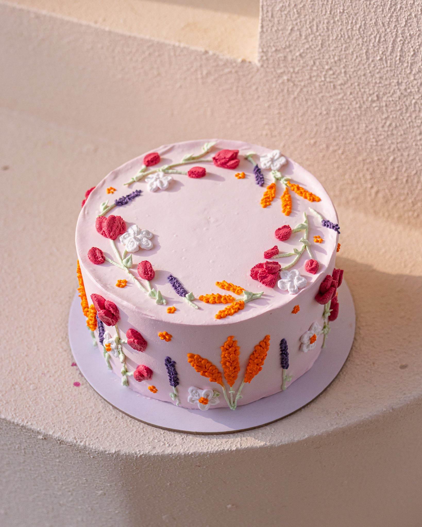 A lavender-hued canvas adorned with hand-piped florals in coral, violet, and tangerine — like a garden kissed by sunset light.