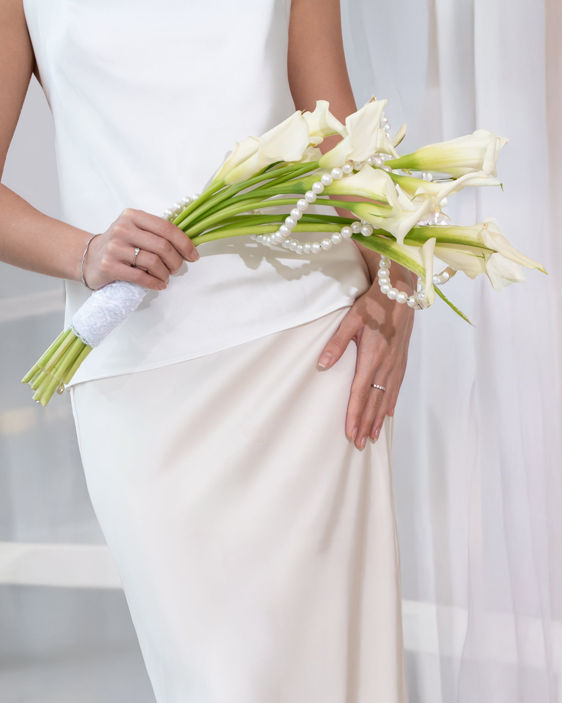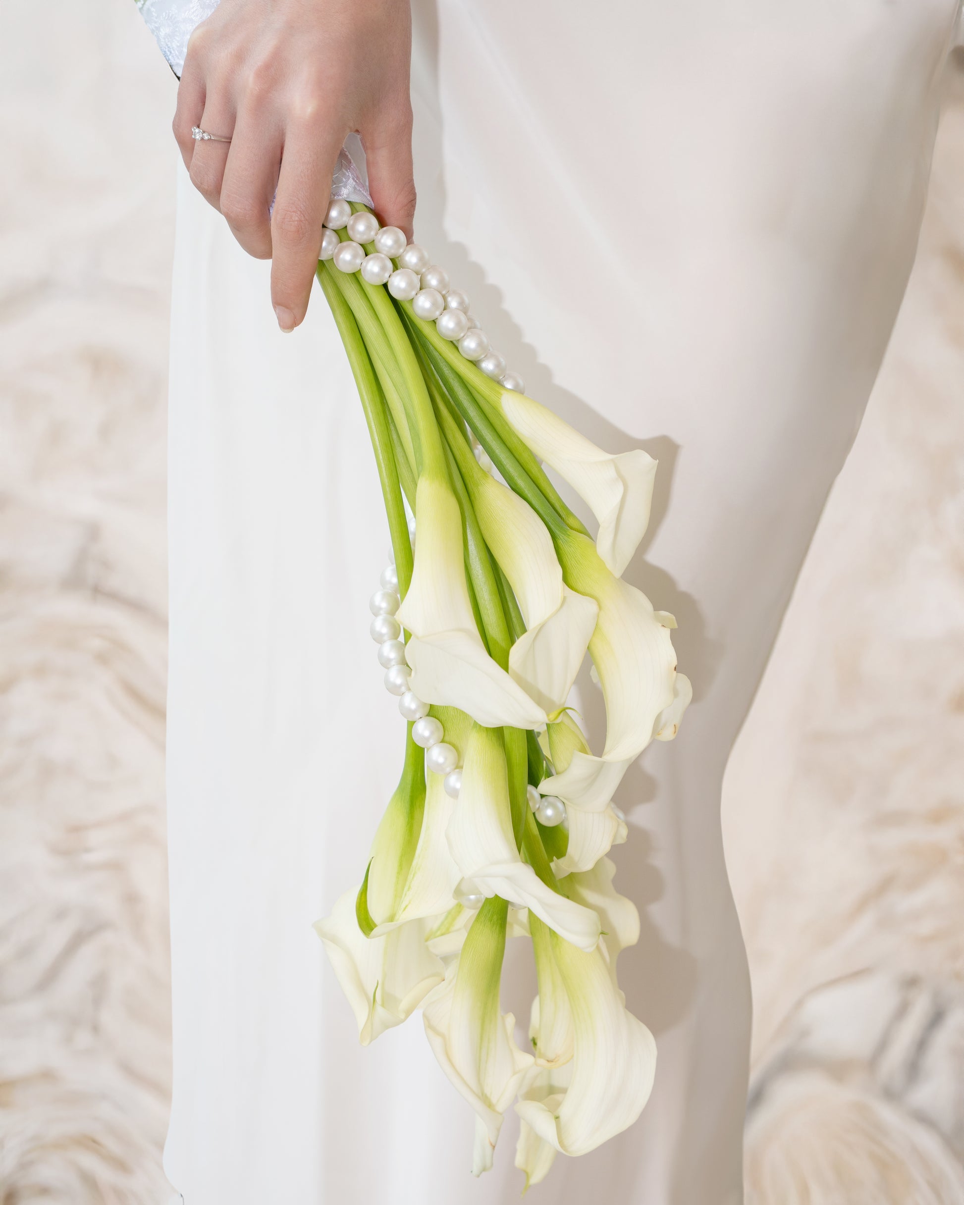 Refined and effortlessly elegant, Lumière Pearl features cascading white calla lilies hand-tied with delicate pearl detailing for a soft, luminous finish. Designed with clean lines and graceful movement, this bouquet embodies modern bridal beauty with timeless sophistication.