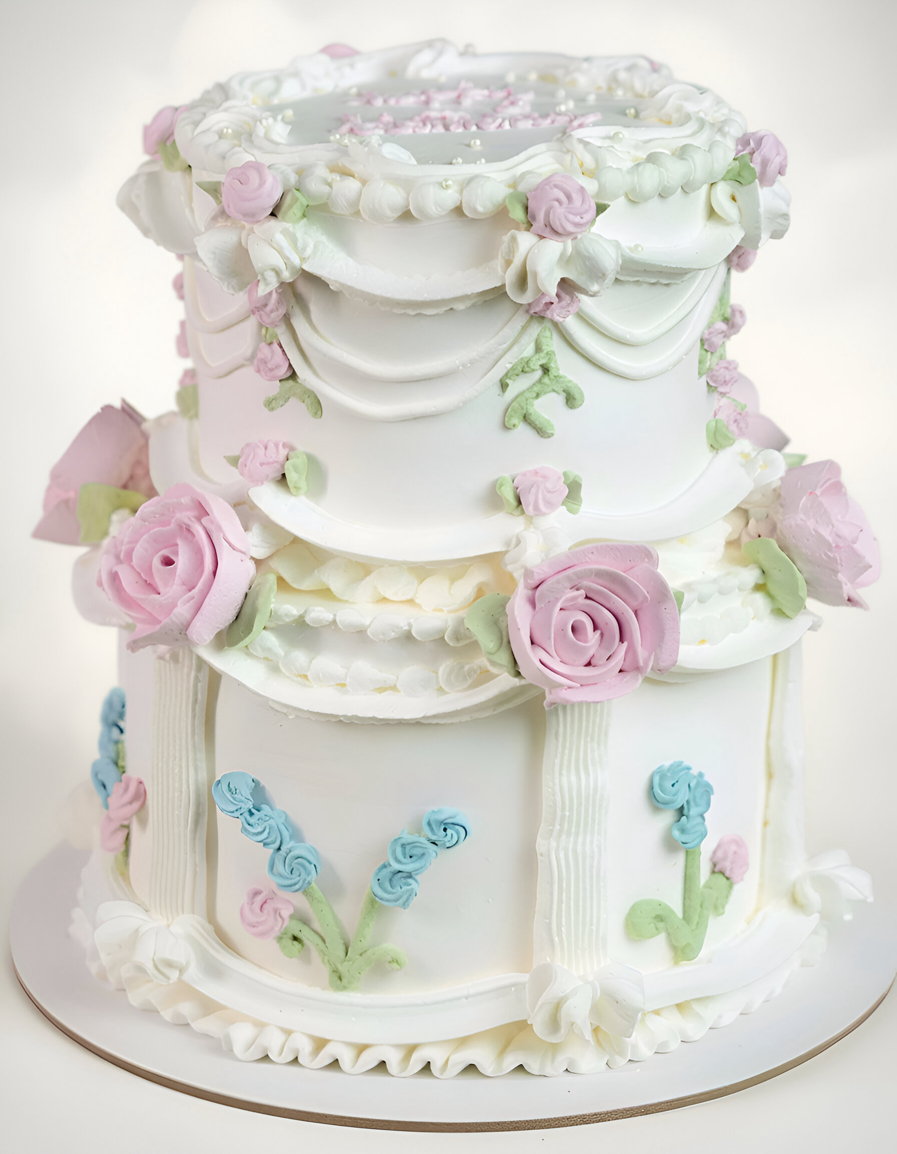 A beautifully crafted celebration cake inspired by soft florals and vintage charm. This two-tier design features smooth white frosting adorned with hand-piped pastel flowers in blush, lavender, and baby blue tones. Finished with delicate pearl details and classic piping, it feels romantic, elegant, and timeless.