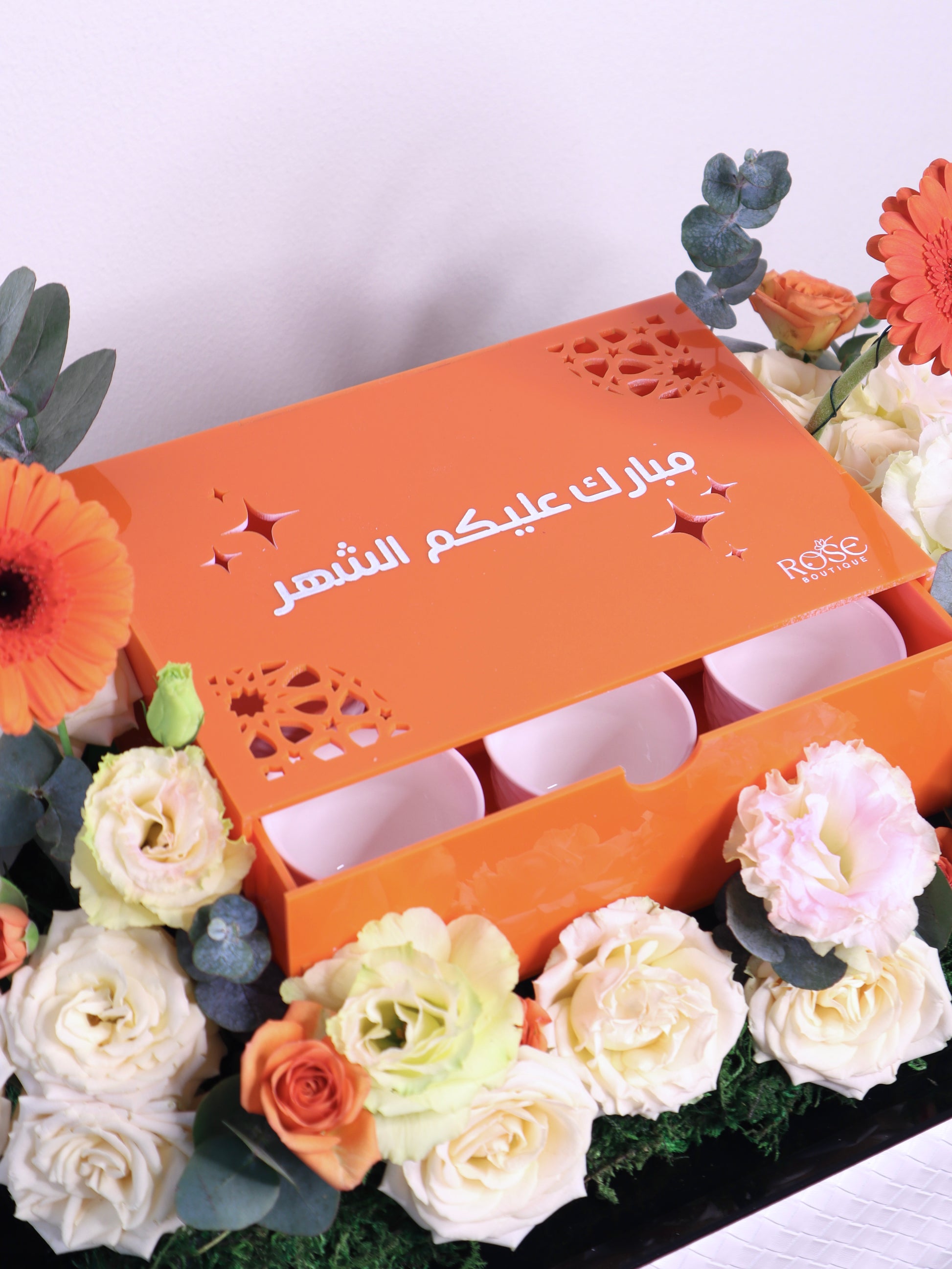 A contemporary set of traditional Arabic qahwa cups presented in a vibrant orange signature box. Designed to add warmth and character to Ramadan gatherings, this set highlights the beauty of hospitality and the timeless ritual of serving qahwa.